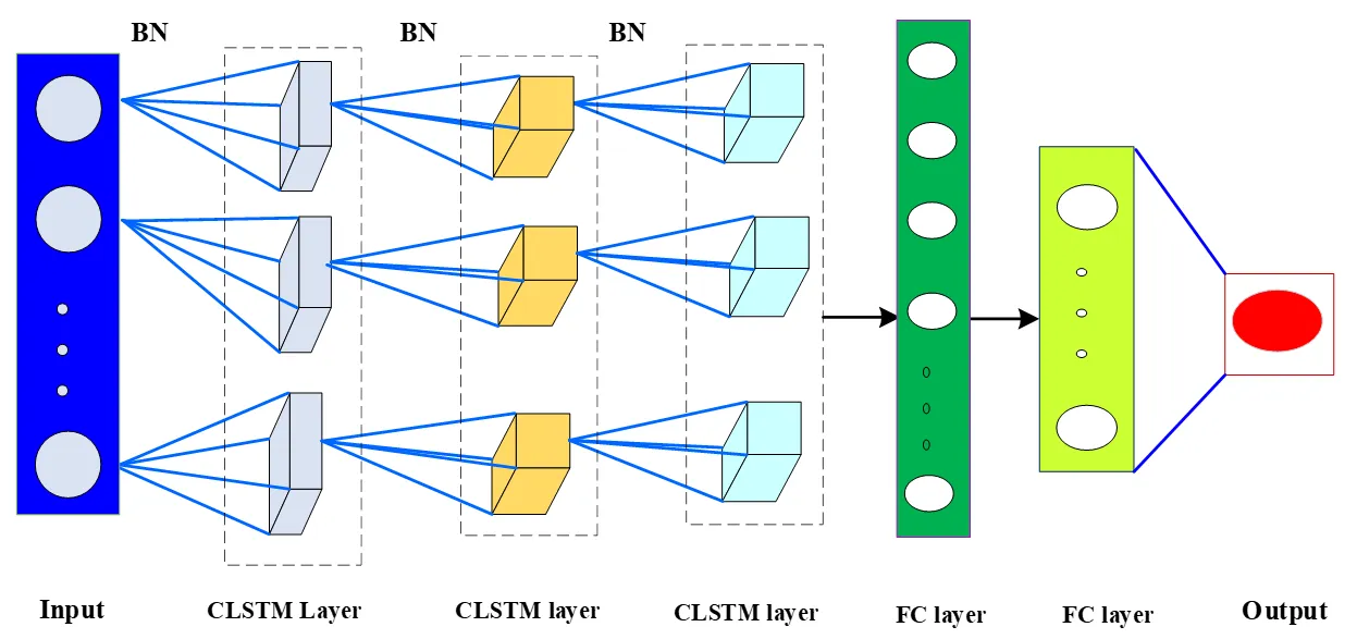 shows the structure of the ST-CNet prediction model proposed in this paper, which extracts the implicit features in the HI by stacking 3-layer CLSTM layers, and then further inputs the extracted features into 2-layer fully-connected (FC) layers to expand the features into one-dimensional. The output layer is a linear regression layer, which is used to predict the degradation trend of the bearing. At the same time, batch normalization (BN) is added between each CLSTM layer to prevent the overfitting problem of ST-CNet.
