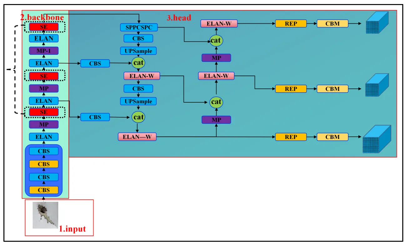 The YOLOV7 model comprises three main components: the input module, the backbone network, and the head output module. The input side mainly contained data preprocessing, including data enhancement and adaptive image padding [
