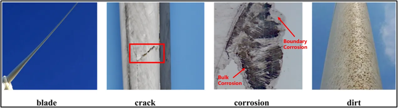 Visual image, as an intuitive and easy-to-obtain information source, plays an indispensable role in the surface damage detection of wind turbines. This detection method provides us with instant feedback on the health status of wind turbines. However, the surface damage of wind turbines is highly complex and diverse. For example, as shown in , the damage categories of wind turbine blades alone include normal, crack, corrosion, and fouling. Traditional image processing and analysis methods, such as threshold segmentation, edge detection, or feature-based matching, are usually hand-crafted and dependent on specific parameter settings, which may lead to limitations in accuracy and reliability in the face of complex and diverse surface damage [