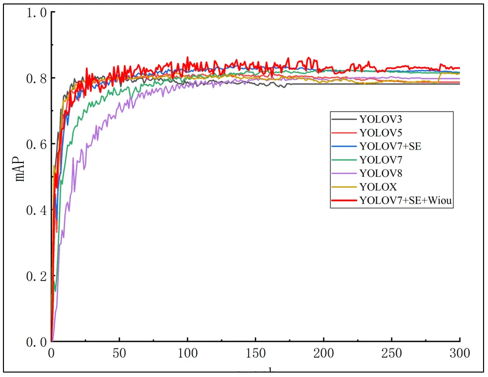 illustrates the performance of various versions of the YOLO (You Only Look Once) object detection models during the training process. The graph shows that all these YOLO variants consistently improve their mAP values as the training progresses, indicating an ongoing enhancement in their performance. However, different models exhibit distinct trends and rates of improvement throughout the training. Notably, the YOLOV7 variant incorporates the SE attention mechanism, and Wiou demonstrates the most outstanding performance during the training phase. Its mAP value surpasses other models within the first 50 epochs and maintains a relatively stable trend throughout the training process. Upon completing 300 epochs, its mAP reaches 86.24%, the highest among all models. Hence, it is evident that the YOLOV7 model with added SE attention mechanism and Wiou learns faster and more stably during the training, ultimately achieving the best overall performance.