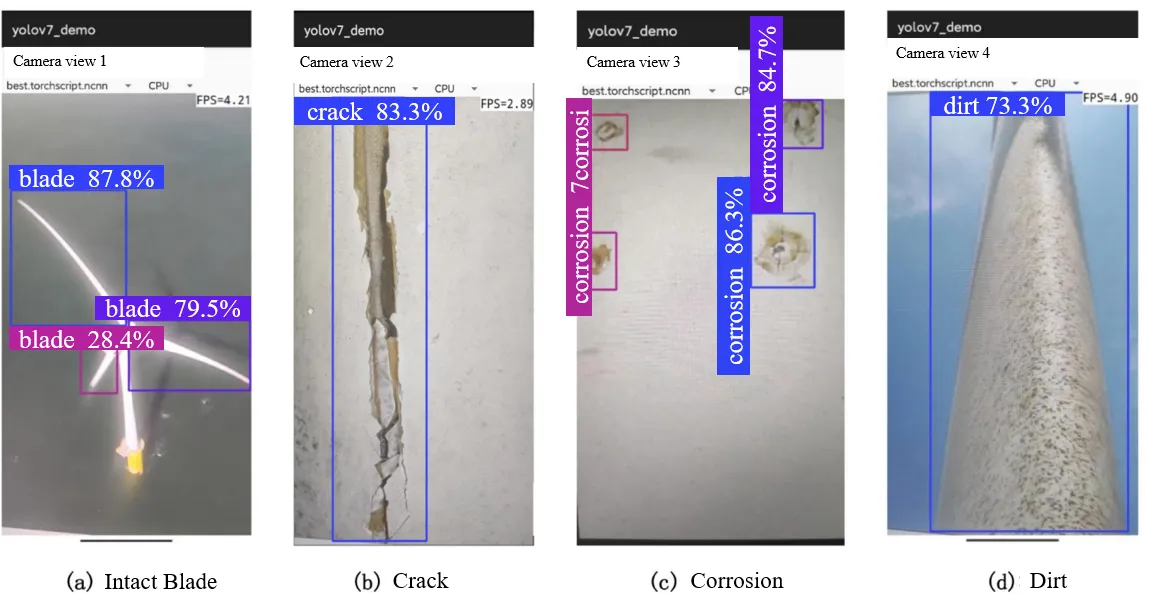 We especially chose YOLOV7 as the object detection method because it is the latest iterative version in the YOLO series, providing faster processing speed and higher accuracy. YOLOV7 has been optimized and improved in random sampling, data enhancement, and multi-scale detection, thus significantly improving its detection performance. With YOLOV7, we can efficiently and accurately identify and locate various damages on the surface of wind turbines in real time. This highly automated and accurate detection provides strong technical support for subsequent maintenance, repair, and decision-making, ensuring the stable operation and long life of wind turbines.