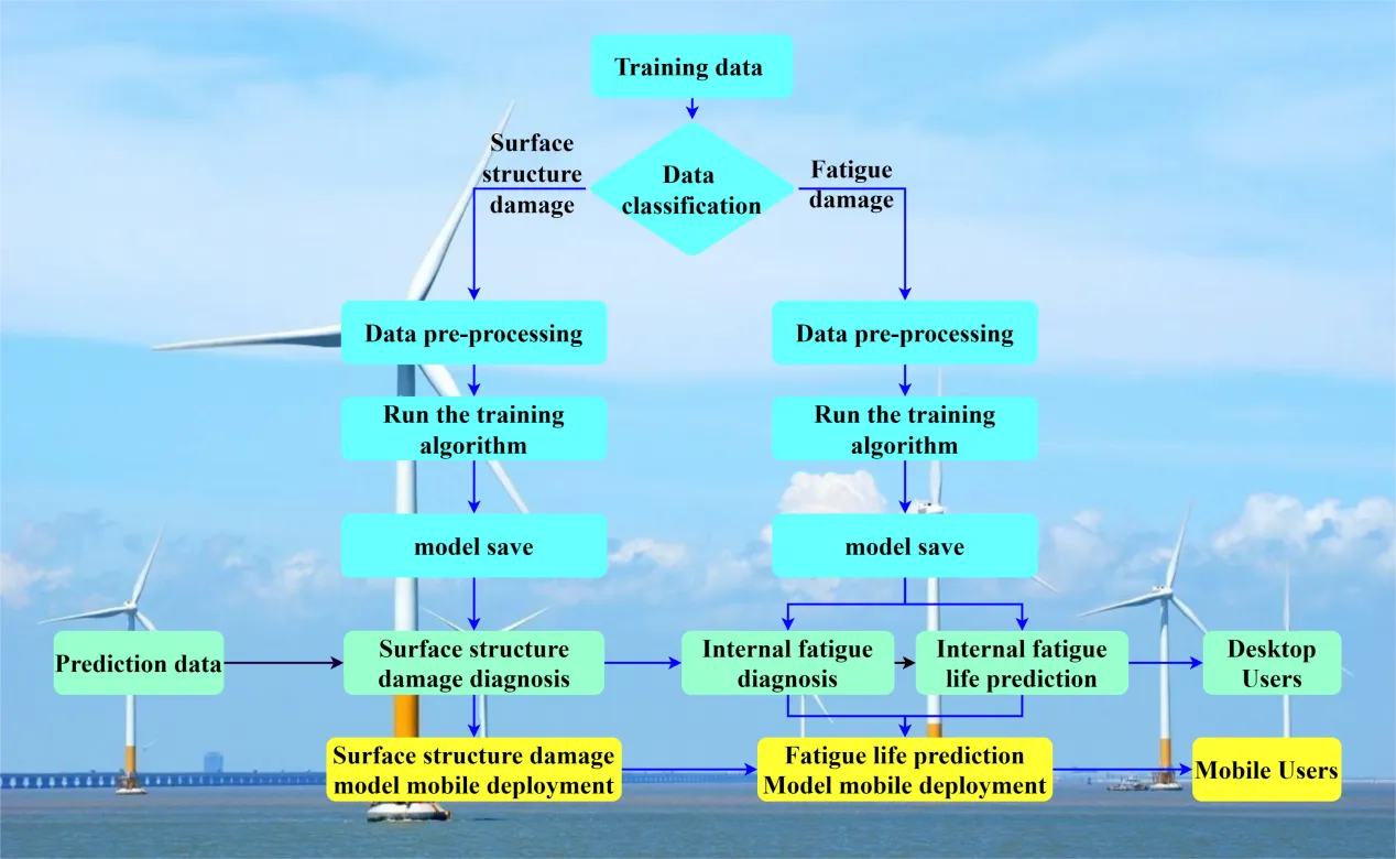 In the data acquisition phase, the system sources data from multiple channels, including surface structural and fatigue damage data. Subsequently, the gathered data is classified into two distinct types to facilitate subsequent processing. Data preprocessing is a crucial step in guaranteeing data quality, ensuring the trained model’s high accuracy.