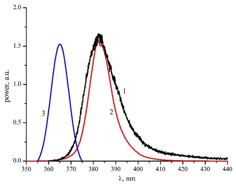 . 1—spectra of the exciton resonant excitation at RT; 2—spectrum of the sample illumination by LED RF-UVXC35LN-UD (Refond), taking into account the absorption of the sample; 3—365 nm emission of DRSh-500 accentuated by the monochromator KSVU-1.