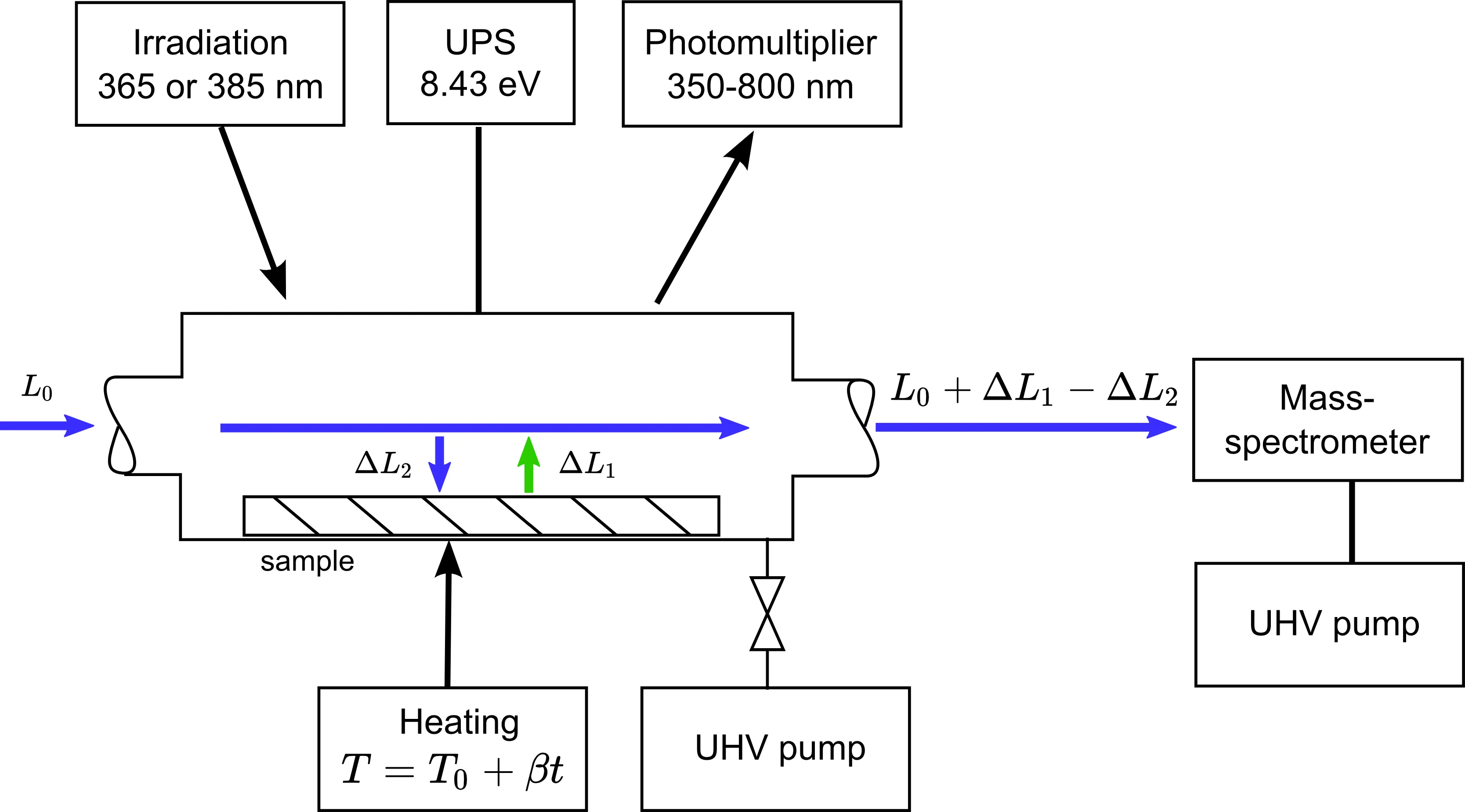 11] had two sapphire windows, one for UPS excitation light (146.6 nm, 8.43 eV) and another for UV-VIS photoexcitation of the sample and for thermo-PL detection. The continuous analysis of the gas composition above the sample was carried out on the first reactor at the pressures of 10