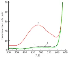 . Thermally stimulated luminescence (TSL) of F-type and V-type centers in ZnO/ZnO1−x /O− illuminated by a monochromatic light. Curve 1: λ = 365 nm, Curve 2: λ = 385 nm. Curve 3: λ = 385 nm, the sample preliminarily kept in an oxygen atmosphere at 10−1 Torr.