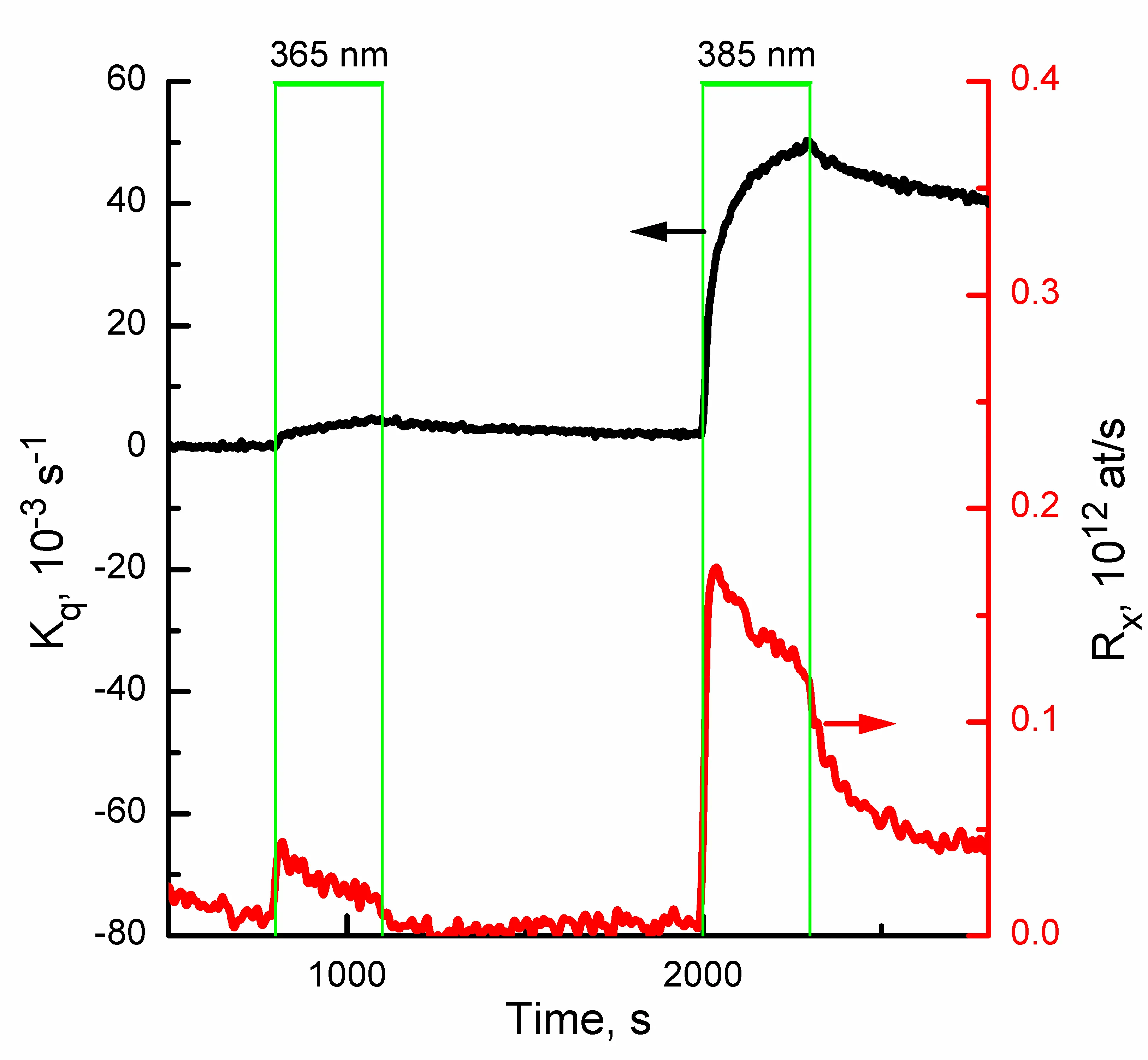 . Rates of kq = Rq/N and Rx over ZnO/ZnO1−x/O− under irradiation in the region of interband absorption at λ = 365 nm and exciton absorption at λmax = 385 nm. The incident photon fluxes were 1.8 × 1016 (±20%) quanta per second, P = 1.2 × 10−6 Torr. For POIE test reaction the irradiating in the exciton absorption band is about 5–8 times more effective than in the interband absorption.