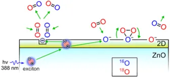 . The radiative decay of an exciton is excluded by a 2D structure ZnO/ZnO1−x/O−, in which the exciton decays nonradiatively into a pair of long-lived (up to 8 × 103 s) electron and hole local states, on which a chemical reaction take place.