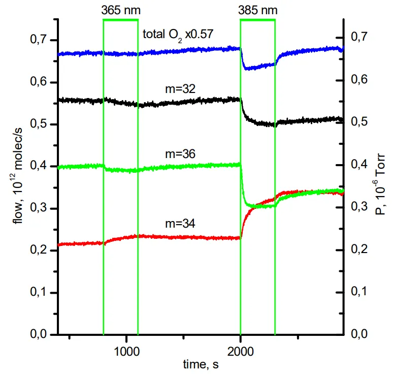 −. This can be verified by analyzing the interaction of active centers with oxygen molecules from the gas phase, since the criterion for the activity of a photo-catalyst is its activity in the POIE reaction. To characterize the interaction of gas molecules with a photo-activated surface, we analyzed the TDS of oxygen adsorbed onto ZnO/ZnO