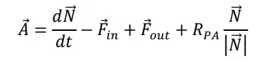 The first two terms on the right side of (1), $$\vec{F}_{in}-\vec{F}_{out}$$, correspond to the flow regime. The third term $$-R_{PA}\frac{\vec{N}}{|\vec{N}|}$$ is “photo-adsorption”. The fourth one $$\vec{R}_{PD}$$ is “photo-desorption”. The fifth one is “hetero-molecular exchange”, and the last one is “homo-molecular exchange”. The equation is a differential non-linear one, however the value under the differential is known, and the equation can be transformed into an algebraic one. In the experiments performed, photo-desorption was not observed, therefore, we consider it to be equal to zero.