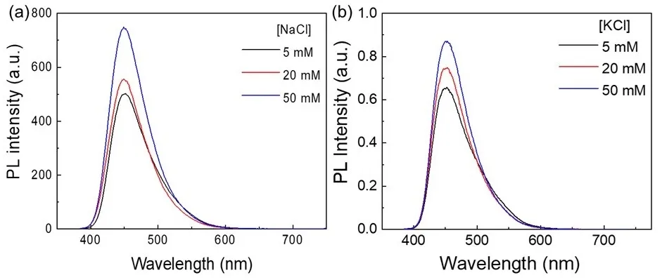 Fluorescence spectra of CD solutions were measured under varying concentrations of sodium chloride (NaCl) and potassium chloride (KCl) at 5, 20, and 50 mmol/L, while keeping all other conditions constant. As shown in