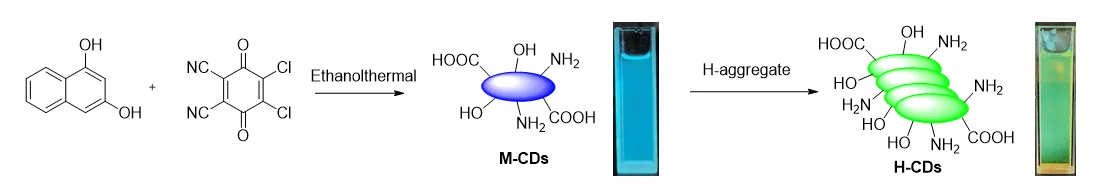 2 and the formation of phenoxy radicals. This promotes π-π stacking and molecular aggregation through radical coupling and hydrogen bonding; (2) Under high-temperature ethanol conditions, the cyano groups of DDQ undergo nucleophilic addition, followed by rearrangement and hydrolysis to yield carboxyl or amide functionalities. Alternatively, alcoholysis may generate imine esters that subsequently hydrolyze into primary amides, contributing to nitrogen doping; (3) The resulting hydroxyl, carboxyl, and amino groups participate in dehydration-condensation reactions, forming a molecularly cross-linked network. (4) Progressive aromatization and partial carbonization result in the formation of supramolecular carbon dots, stabilized by noncovalent interactions rather than graphitized cores. When ethanol is used as the solvent, the final H-CD solution appears brown under white light and emits green fluorescence, consistent with the formation of emissive molecular aggregates.