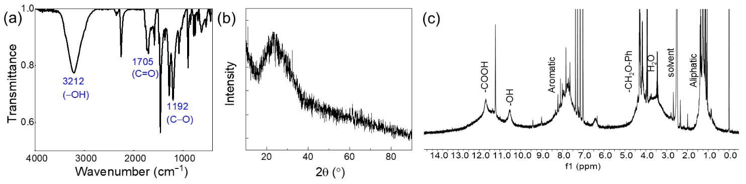 . (<strong>a</strong>) FT-IR spectrum of H-CDs.; (<strong>b</strong>) XRD patterns of H-CDs; (<strong>c</strong>) <sup>1</sup>H-NMR (400 MHz, DMSO-d<sub>6</sub>) spectrum of H-CDs.