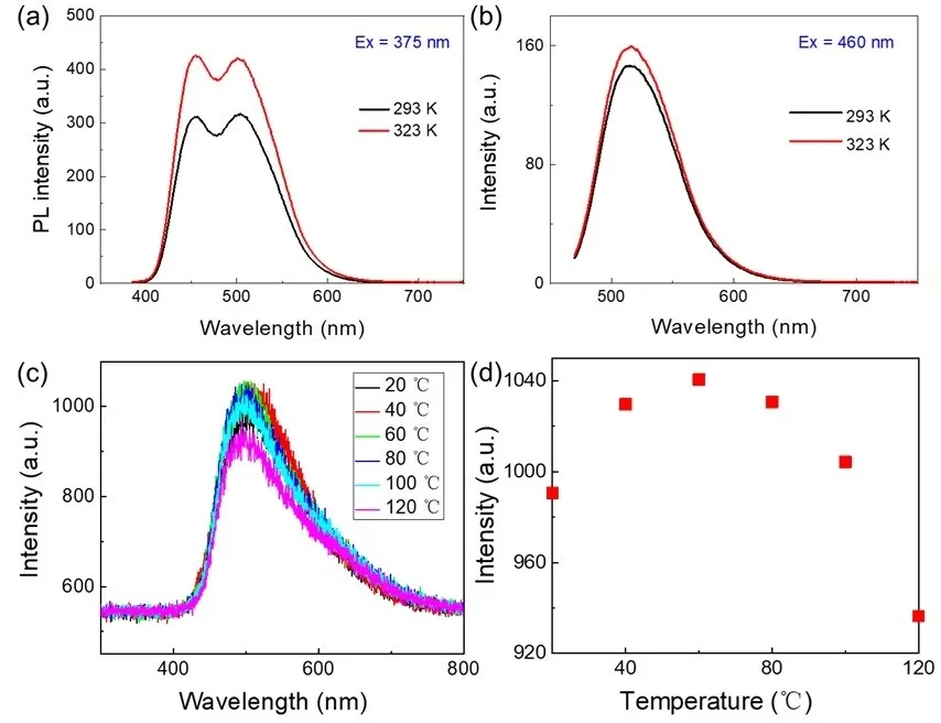 . (<strong>a</strong>) Effect of increasing temperature on the emission spectra of H-CDs (C = 0.25 mg/mL) measured with excitation wavelengths at 375 nm. (<strong>b</strong>) Effect of increasing temperature on the emission spectra of H-CDs (C = 0.25 mg/mL) was measured with excitation wavelengths of 450 nm. (<strong>c</strong>) Fluorescence emission spectroscopy of H-CDs at different temperatures (20–120 °C). (<strong>d</strong>) The variation of fluorescence intensity of H-CDs with temperature.