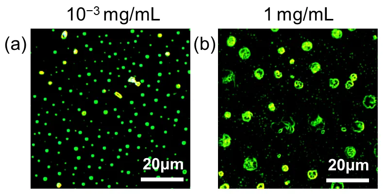 . Dark-field optical micrographs of H-CDs prepared at concentrations of (<strong>a</strong>) 10<sup>−3 </sup>mg/mL and (<strong>b</strong>) 1 mg/mL.