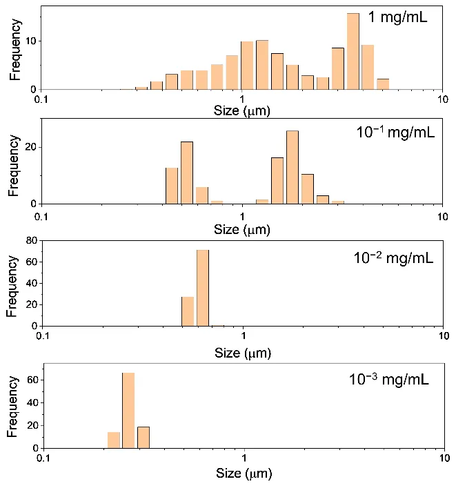 . Particle size distribution histograms of H-CDs at different concentrations measured by laser particle size analyzer. From bottom to top: 10<sup>−3</sup> mg/mL, 10<sup>−2</sup> mg/mL, 10<sup>−1</sup> mg/mL, and 1 mg/mL.
