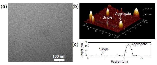 . (<b>a</b>) Transmission electron microscopy (TEM) images of H-CDs. (<b>b</b>) AFM images of H-CDs with individual carbon dots and aggregates are indicated. (<b>c</b>) Height profiles corresponding to the selected particles are marked in panel (<b>b</b>).