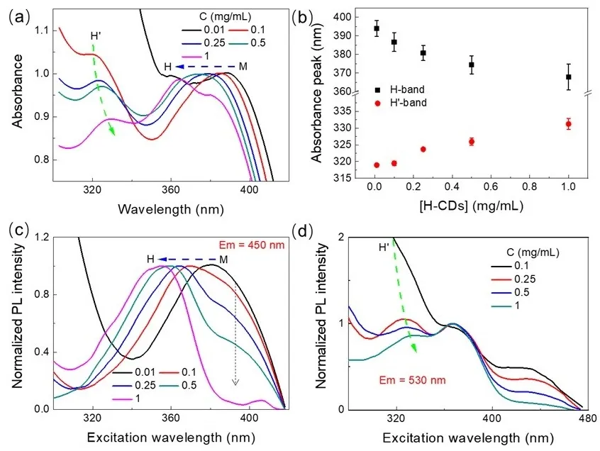 a, the UV-vis absorption spectra of H-CDs evolve significantly with increasing concentration. In comparison with the monomeric CDs (M-CDs), two new absorption bands emerge, exhibiting opposite spectral shifts: the absorption peak at ~395 nm gradually blueshifts to ~370 nm, while the peak at ~318 nm red-shifts to ~330 nm (