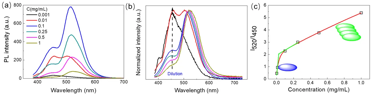 450) versus concentration, revealing a clear concentration-dependent increase in the relative contribution of the red-shifted emission band. At low concentrations (<0.01 mg/mL), the H-CDs mainly exist as dispersed or loosely associated species, emitting strongly around 450 nm. This emission is attributed to intrinsic electronic transitions of the individual carbon dot units or small oligomers. Above a critical concentration (~0.1 mg/mL), increased molecular packing via face-to-face π-π stacking leads to the formation of ordered H-aggregates, altering the electronic environment and resulting in a dominant emission band near 520 nm. The observed red-shift of emission with aggregation contrasts with classical H-aggregate models that typically predict a blue shift. This discrepancy suggests aggregation induces a rearrangement in molecular packing and electronic coupling within the H-CDs, leading to new emissive states. Thus, the concentration-dependent PL changes reflect a dynamic equilibrium between dispersed and aggregated forms of H-CDs, where supramolecular assembly modulates their optical properties.
