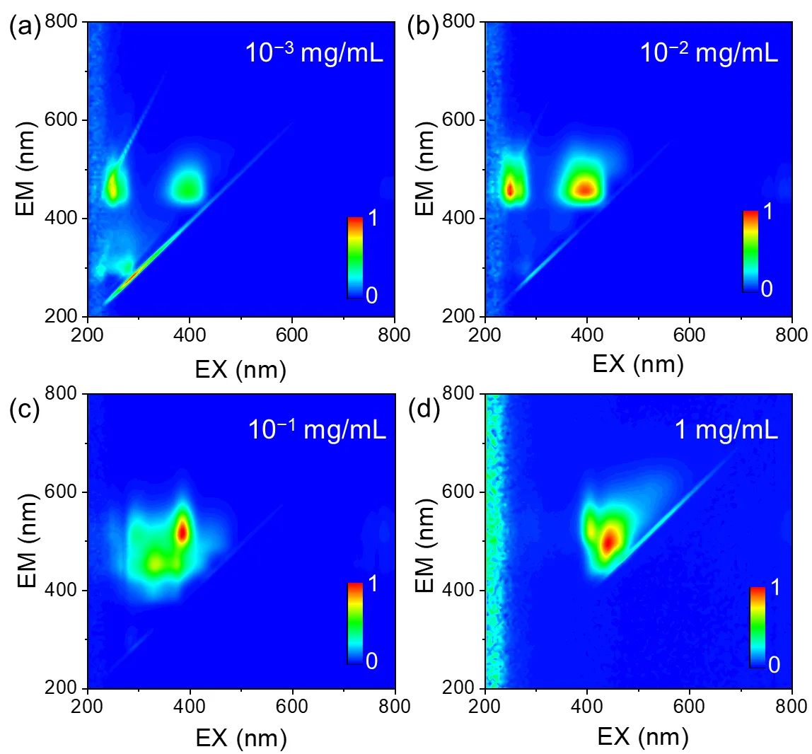 a,b), the fluorescence spectra exhibit dual emission centers centered around 460 nm when excited at approximately 249 nm and 398 nm, corresponding to emission from well-dispersed individual carbon dots. When the concentration reaches a critical threshold of 0.1 mg/mL (