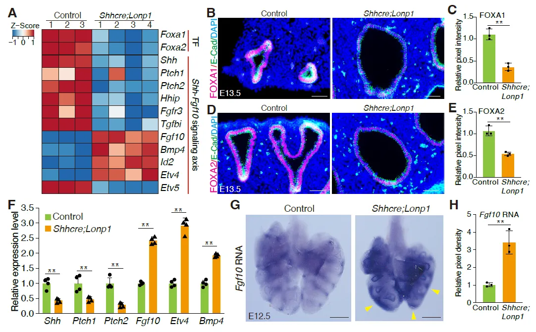 Shhcre;Lonp1 mutant embryos were harvested at E11.5. Lungs were placed on a Nucleopore Trak-Etch membrane (Whatman; 8 μm) and cultured at the air/liquid interface with DMEM-F12 and Penicillin-Streptomycin (15140122, Gibco, MA, USA). To antagonize FGF10 signaling, SU5402 (SML0443, Sigma) was added at a final concentration of 10 μM. DMSO was used as a diluent control. Lungs were cultured at 37 °C in 5% CO