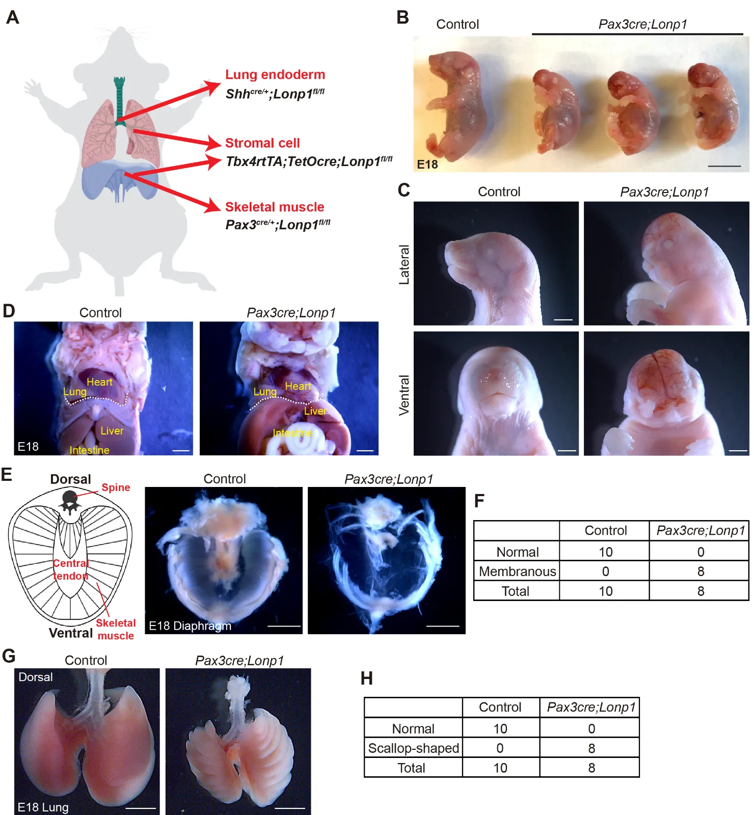 Figure 1. <b><i>Lonp1</i> is required for skeletal muscle development in the diaphragm.</b> (<strong>A</strong>) Diagram showing the tissue-specific inactivation of <em>Lonp1</em>. (<strong>B</strong>,<strong>C</strong>) Embryonic (<strong>B</strong>) and craniofacial (<strong>C</strong>) phenotypes of <em>Pax3cre;Lonp1</em> and control mice at E18. Scale bars, 0.5 cm in (<strong>B</strong>) and 1 mm in (<strong>C</strong>). (<strong>D</strong>) Anatomic localizations of internal organs of <em>Pax3cre;Lonp1</em> and control mice at E18. The diaphragm is marked by the dashed white line. Scale bars, 1 mm. (<strong>E</strong>,<strong>F</strong>) Diaphragms of <em>Pax3cre;Lonp1</em> and control mice at E18. The cartoon on the left shows major tissues in the normal diaphragm. Scale bars, 0.2 cm. Quantifications were shown in (<strong>F</strong>). (<strong>G</strong>,<strong>H</strong>) Lungs of <em>Pax3cre;Lonp1</em> and control mice at E18. Scale bars, 0.2 cm. Quantifications were shown in (<strong>H</strong>).