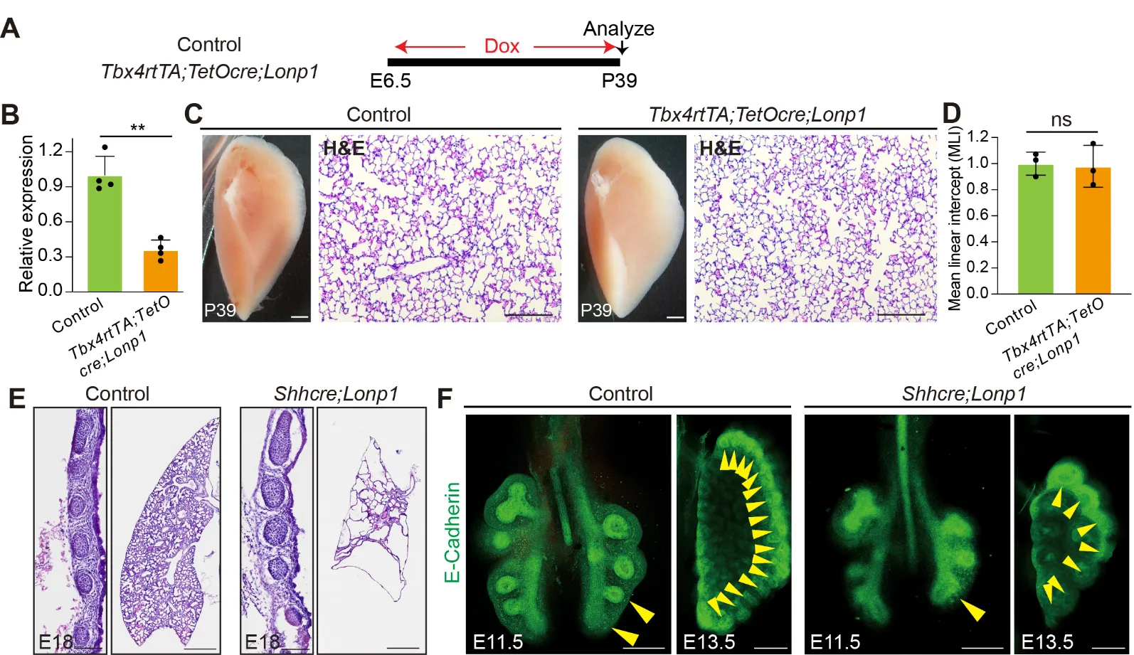 Lonp1 in lung endoderm led to drastic lung hypoplasia with the replacement of lobes by cyst-like structures [