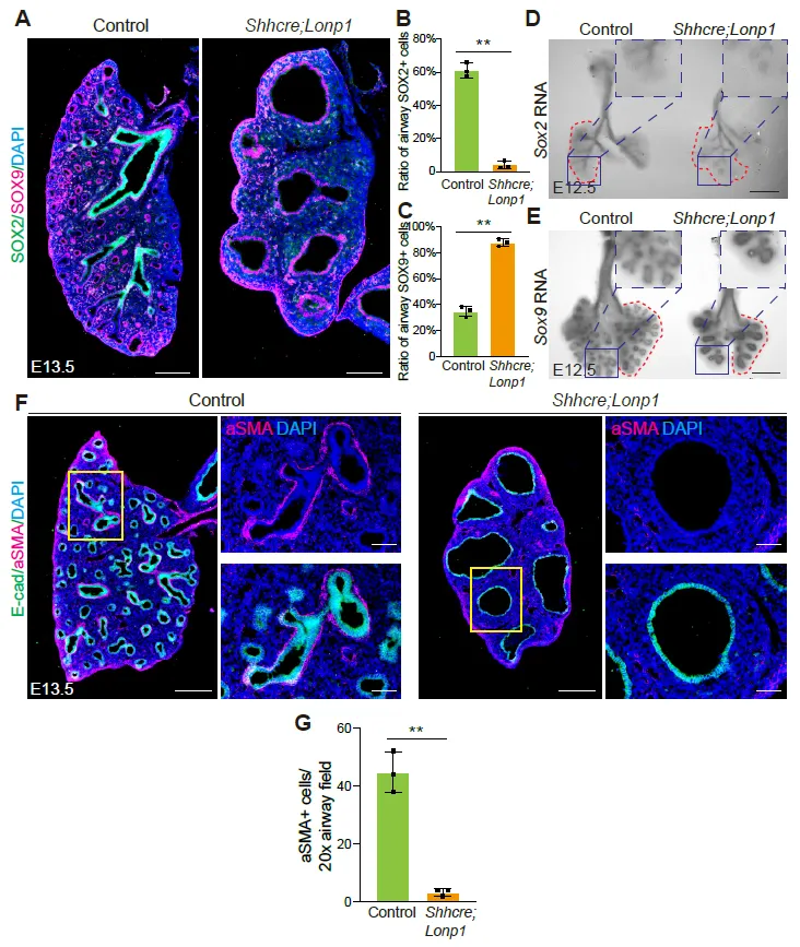 Trachea and lungs from embryos were fixed in 4% paraformaldehyde (Electron Microscopy Sciences, Hatfield, PA, USA) diluted in PBS overnight at 4 °C. Samples were embedded in either paraffin or OCT (Electron Microscopy Sciences) for sectioning. Antigen retrieval was performed before serum-mediated blocking using high-PH retrieval buffer (10 mM Tris, 1 mM EDTA, pH 9.0). Primary antibodies with final concentrations used for immunofluorescence staining are: rabbit anti-SOX2 polyclonal antibody [8 mg/mL] (NB110-37235, Novus Biologicals, Centennial, CO, USA), mouse anti-SOX9 monoclonal antibody [5 mg/mL] (AMAB90795, Sigma, Tokyo, Japan), mouse anti-aSMA monoclonal antibody [5 mg/mL] (A2547, Sigma), mouse anti-E-cadherin monoclonal antibody [8 mg/mL] (610181, BD Transduction Laboratories, NJ, USA), rabbit anti-E-cadherin polyclonal antibody [5 mg/mL] (3195, Cell Signaling Technology, Danvers, MA, USA), rabbit anti-FOXA1 monoclonal antibody [5 mg/mL] (ab173287, Abcam, Cambridge, UK) and rabbit anti-FOXA2 monoclonal antibody [5 mg/mL] (ab108422, Abcam). The following secondary antibodies were used with final concentration: Cy3-conjugated goat anti-mouse IgG [2 mg/mL] (115-165-003, Jackson ImmunoResearch, West Grove, PA, USA), Cy3-conjugated goat anti-rabbit IgG [2 mg/mL] (111-165-144, Jackson ImmunoResearch), AF488-conjugated goat anti-mouse IgG [2 mg/mL] (A-11001, Invitrogen, Carlsbad, CA, USA), AF488-conjugated goat anti-rabbit IgG [2 mg/mL] (A-11008, Invitrogen). All images were acquired on the ZEISS AxioImager 2, except for slide scans on Olympus SLIDEVIEW VS200. 20X or 40X IF images were used to quantify cells labeled by specific markers. At least 3 sections per mouse and 3 mice per genotype were analyzed for each condition.