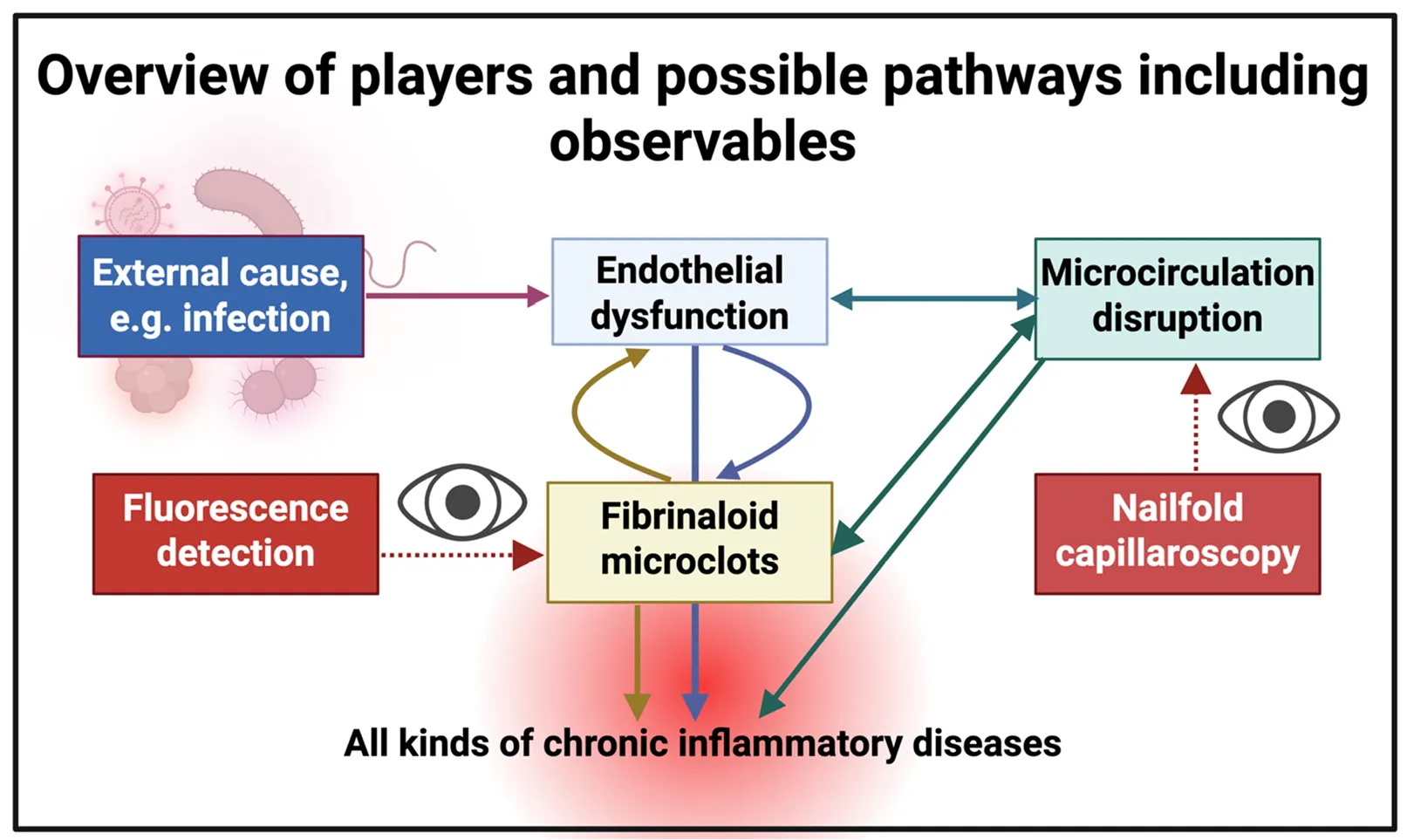 . Cartoon illustrating the systems aspects of the main features of this prospective review. Endothelial dysfunction, the result of a deterministic ‘external’ cause such as (a new or reactivated) infection, trauma, or stress, leads to the disruption of the microcirculation and to fibrinaloid microclots, each of which can potentially exacerbate the others. Our focus here is on nailfold capillaroscopy, though we have rehearsed the methods for microclot detection. Endothelial (dys)function <i>in vivo</i> is commonly assessed via flow-mediated dilatation [