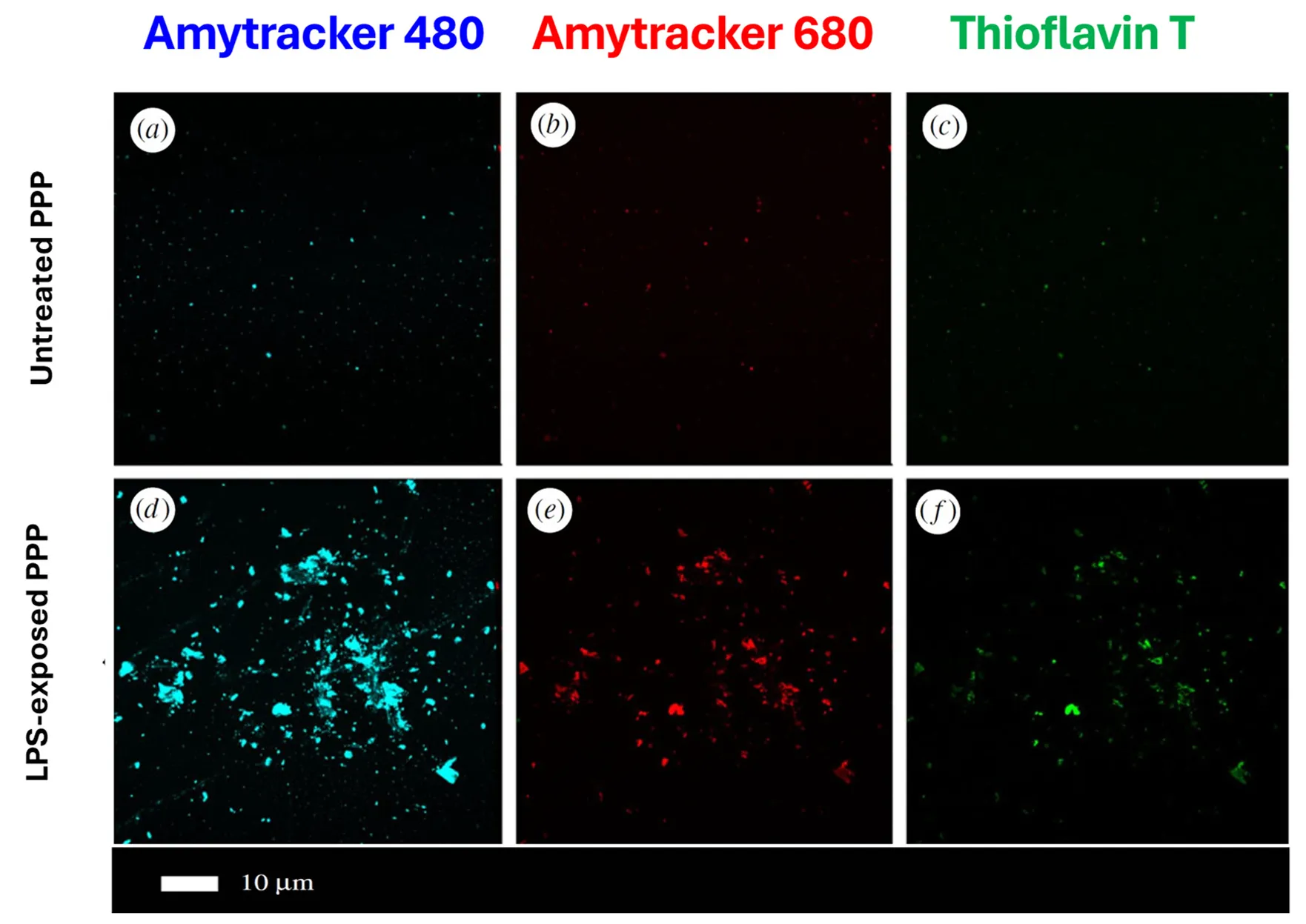 . A typical example of fibrinaloid microclots. Platelet-poor plasma was treated with thrombin and stained either with one of two oligothiophene [<a href="#B26" class="html-bibr">26</a>,<a href="#B27" class="html-bibr">27</a>,<a href="#B28" class="html-bibr">28</a>] Amytracker™ dyes (<strong>a</strong>,<strong>b</strong>,<strong>d</strong>,<strong>e</strong>) or with thioflavin T (<strong>c</strong>,<strong>f</strong>) . In one case (<strong>d</strong>–<strong>f</strong>), a small amount of bacterial lipopolysaccharide was added prior to the thrombin. Modified from the CC-BY 4.0 publication [<a href="#B6" class="html-bibr">6</a>].