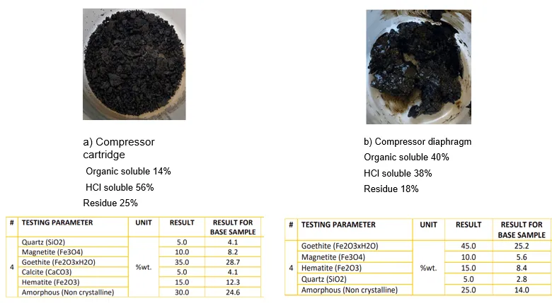 Following the frequent compressor strainer blockages, which had become a routine task for clean-out activities, the engineering team decided to investigate the root cause of these issues. They began by analysing the ingredients of the inlet flashed gas to identify the components contributing to the blockages. This analysis aimed to pinpoint the specific substances causing the H