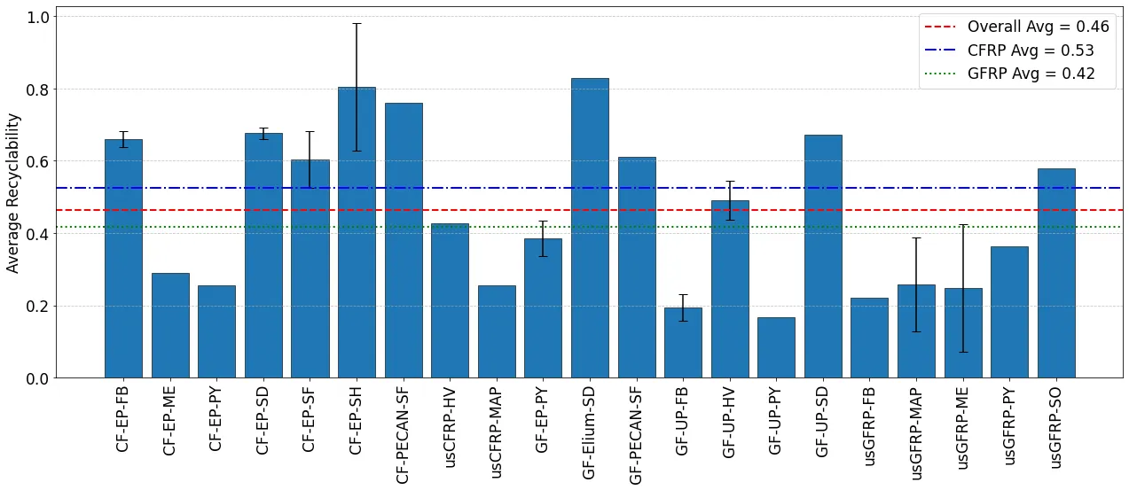 For innovative materials, CF-PECAN (carbon fibre-polyester covalent adaptable network), GF-Elium and GF-PECAN, because they are relatively new materials, the research on their recyclability is somewhat limited, with only one record for each material from the literature [