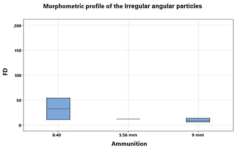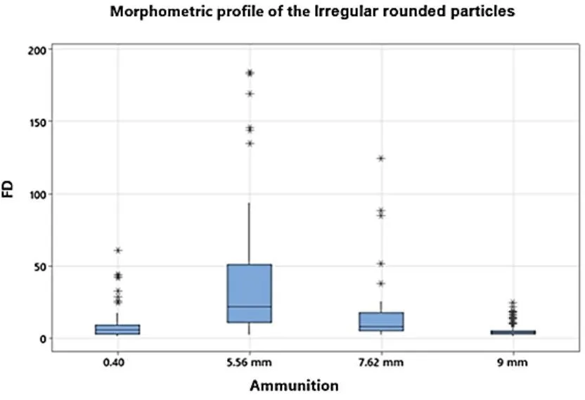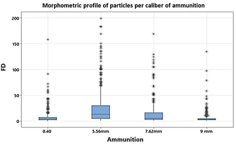 FD measurements were performed using ImageJ (version 2.3.0/1.53q) software to determine the particle length. Morphology analysis used the shape descriptors C, AR, and R. The FD data are summarized in , which includes the measurement intervals of particle FD, the caliber of the ammunition, and the body region where the particles were collected. This information is crucial for identifying the predominant morphometric types of particles produced by short or long firearms using ammunition calibers of 0.40, 9 mm, 5.56 mm, and 7.62 mm. The characteristic GSR particles were categorized into classes, as shown in .