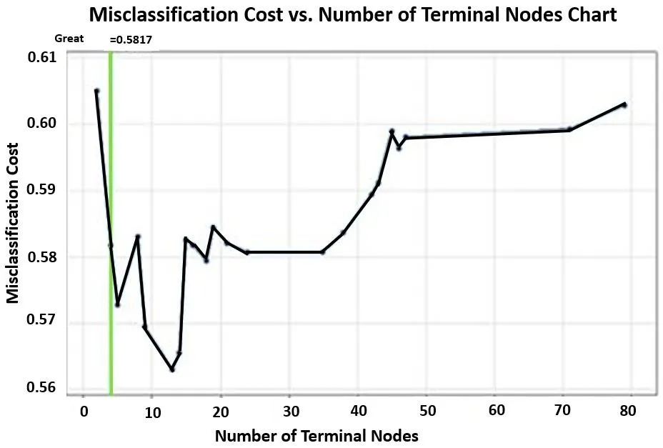 The K-fold method was applied for cross-validation, with rows randomly assigned to each fold. This approach is particularly appropriate for datasets with fewer than 5000 observations. It was also determined that a minimum of ten cases was required for an internal node to be eligible for further splitting, while terminal nodes required at least three cases, preventing further division. A comparative graph was generated to evaluate the tree with the fewest terminal nodes and assess the cost of misclassification, plotting “misclassification cost” against the “number of terminal nodes”.