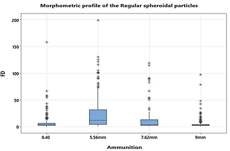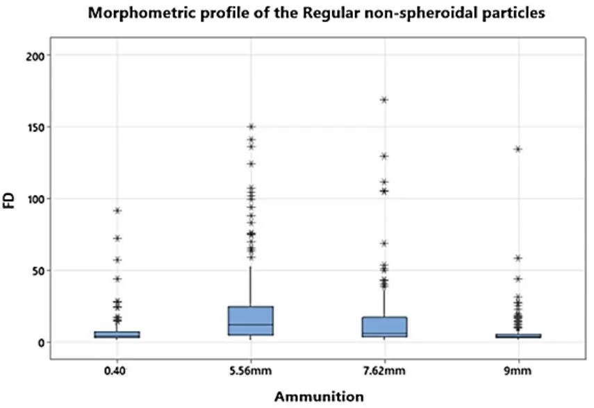 13], summarized in . The morphometric differences among the particles were further illustrated using box plot graphs, providing a clear representation of the variation in particle shapes across different ammunition calibers.