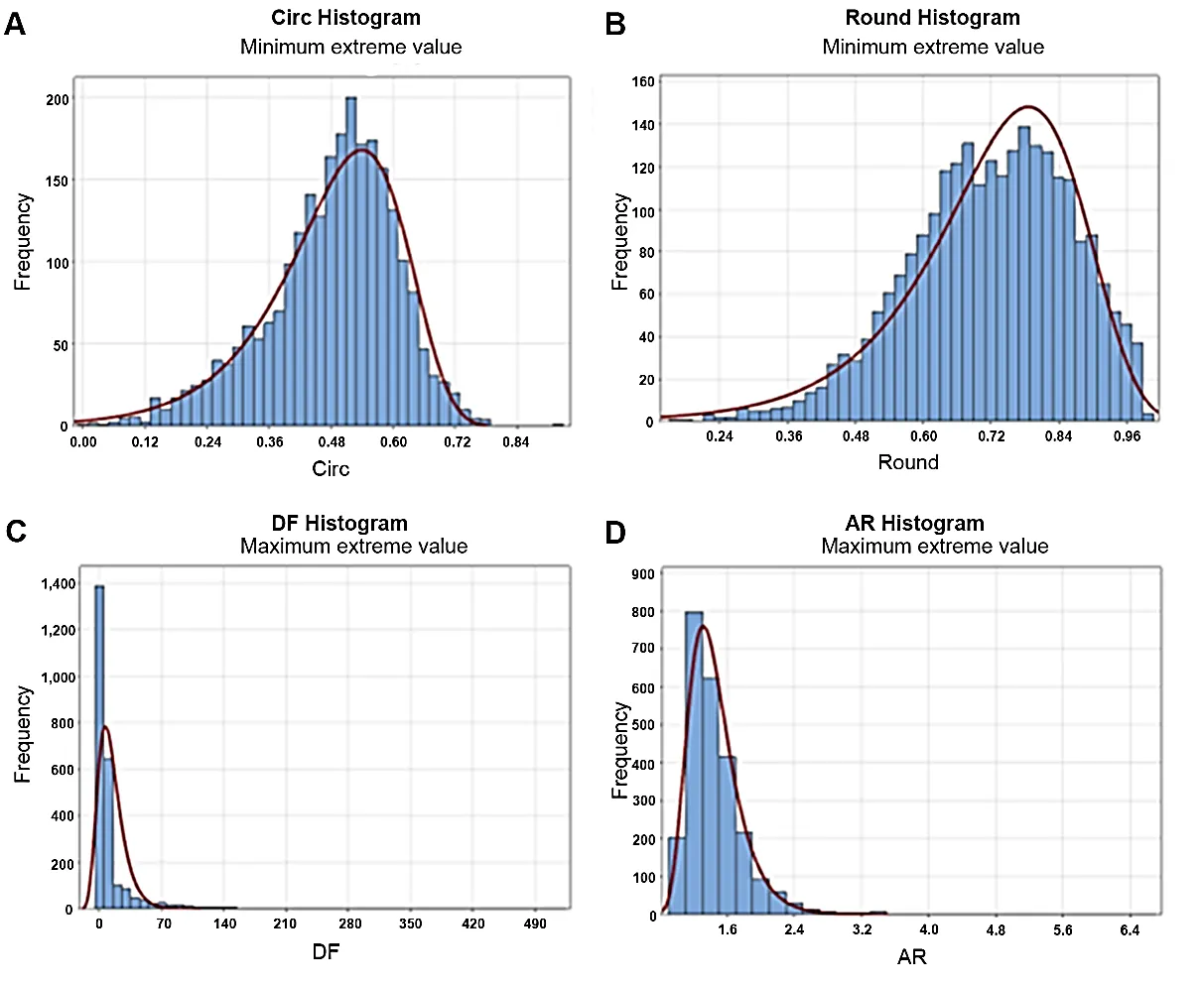 Irregular rounded morphology, with a partially circular shape with R values between 0.25 and 0.49, C between 0.477 and 0.599, and AR between 2.02 and 3.75. |