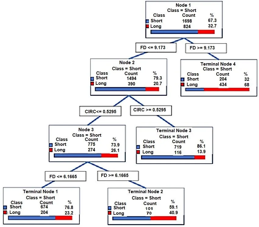 Correlations between morphometric predictors—FD, C, AR, R and firearm class (short vs long) were modelled by the CART algorithm that begins with the full dataset and recursively partitions it into binary subsets based on decision rules defined at internal nodes. The resulting structure includes a root node (representing the entire dataset), internal nodes (which split the data based on specific features), and leaf nodes (terminal nodes that assign a class label or a predicted value). This method was selected due to its robustness in handling non-linear relationships, insensitivity to outliers, and capacity to operate without assuming normality or homogeneity of variances in the data.