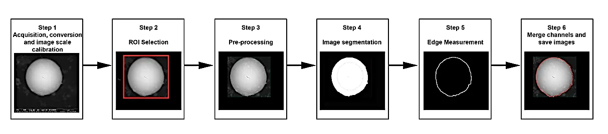 . Overview of the digital image processing and analysis flowchart, divided into six distinct steps. Each step represents a key stage in the automated protocol for measurement and characterization of GSR particles using digital image processing techniques.