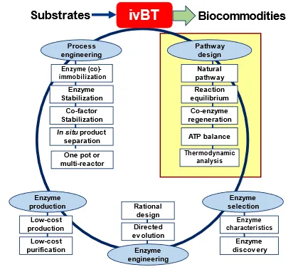 41] (). It is composed of five parts: (i) pathway design, (ii) enzyme selection, (iii) enzyme engineering, (iv) enzyme production, and (v) process engineering [