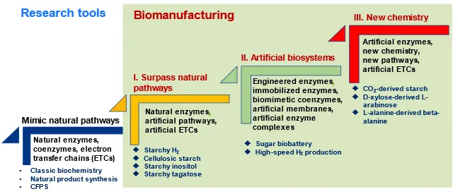 in vitro reconstruction of artificial (nonnatural) metabolic pathways with numerous natural enzymes, artificial enzymes, (biomimetic or natural) coenzymes, or (artificial) membrane or organelles. Its design philosophy are (1) reductionism, that is, an intellectual and philosophical position that interprets complexity of living cells as a sum of their parts (e.g., enzymes, coenzymes, and membranes) and (2) need-directed integrated innovation, that is, the most important and urgent needs motivate to conduct intensive R&D innovations by integrating multi-disciplinary experts.