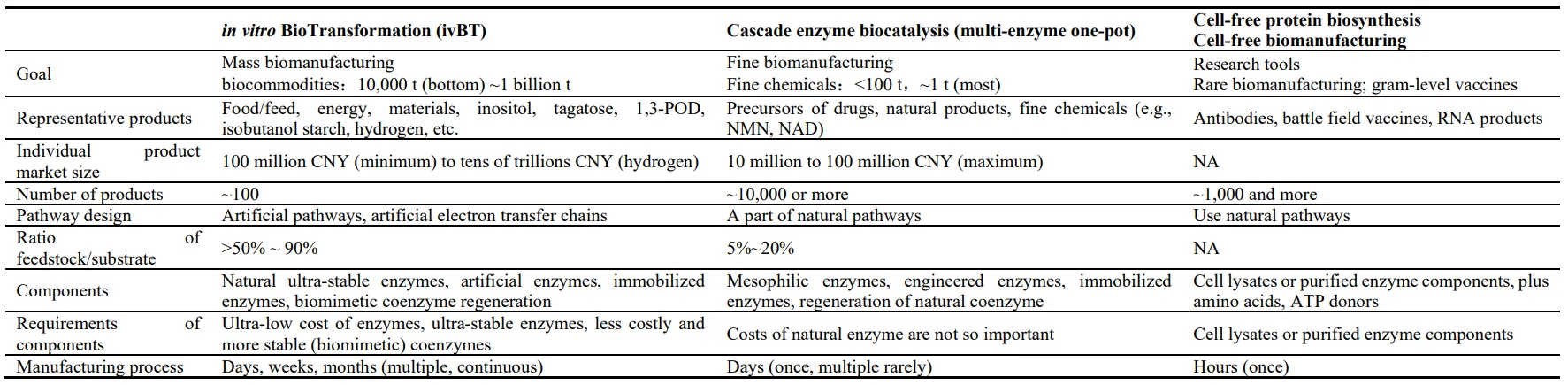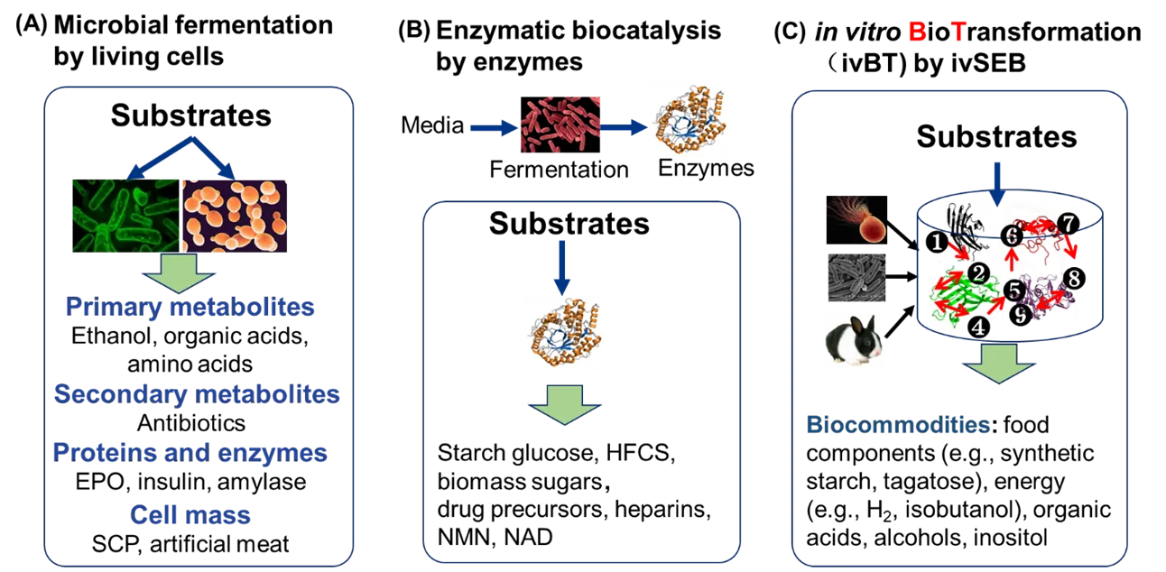 in vitro enzymology, cell-free protein synthesis), revisit ivBT’s design principle, present its representative examples for indepth understanding, highlights its biomanufacturing advantages as compared to the other two biomanufacturing platforms, as well as present its remaining challenges and opportunities. We strongly believe that ivBT mediated by ivSEB would be a disrupt biomanufacturing platform, especially for biocommodities, opening markets worth tens of trillions of CNY, such as the carbon-neutral renewable energy system [