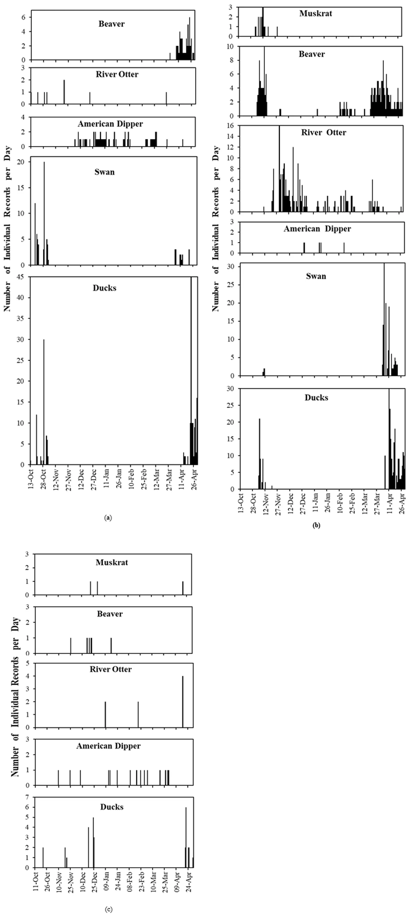 Second, we asked what mammals and bird species visit such relatively small sites of open water from late autumn through to spring, well before the lakes lose all their ice, and what they do at these sites. We hypothesized that: (i) semi-aquatic mammals visit from late autumn through spring mainly for foraging because of the easy access to water, (ii) the few species of water birds known to overwinter in some areas of Yukon would also forage throughout the winter because they require ready access to water, and (iii) migratory waterfowl would visit in spring to forage because their long migrations to subarctic latitudes plus the selective advantage of nesting as early as possible demand nutrient intake at northern sites to maximize reproductive output [