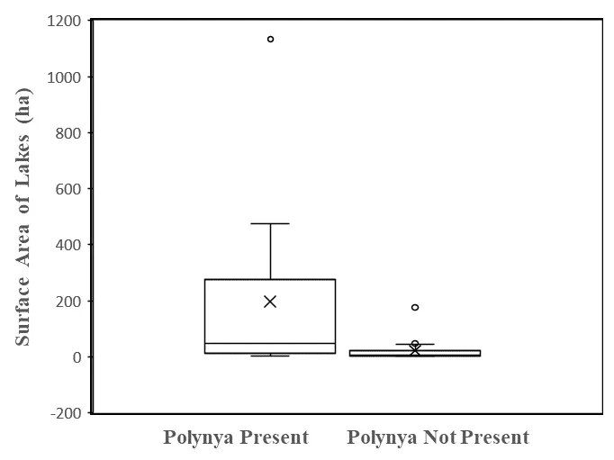 We investigated two questions. First, what are the frequencies and hydrological correlates of various types of open water, in particular outflow polynyas? We proposed three hypotheses: (i) that the mean size of lakes with outflow polynyas is significantly larger than the mean size of lakes without outflow polynyas, (ii) that outflow polynyas are significantly associated with higher stream orders, and (iii) that there is a consistent threshold in upstream catchment size at which outflow polynyas occur in the drainage.