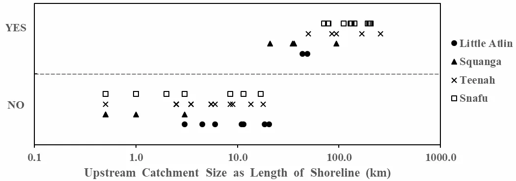 >2 ha) along the main stems and tributaries of 4 headwater drainages (Little Atlin, Squanga, Teenah/Seaforth, Snafu) (a) systematically by helicopter on 10 December 2014, and (b) by repeated ground visits to these drainages in the course of winter field work on river otters from 2012 to 2020 (