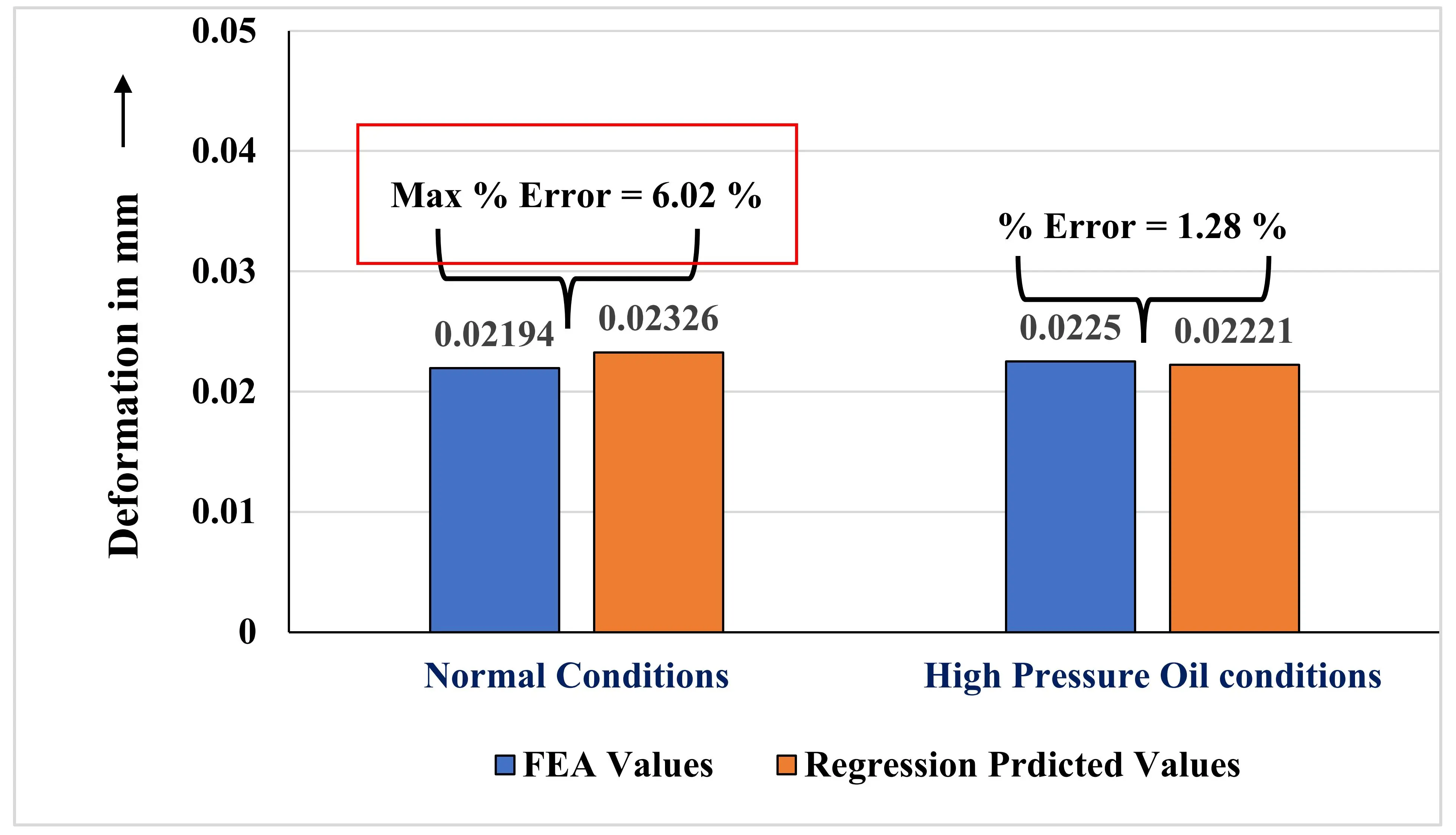 illustrate the percentage error between FEA results and Minitab regression predictions for the optimal material configuration under both environmental conditions. The stress error graph confirms that the predicted values for equivalent stress, shear stress, and normal stress closely align with the experimental results, with all errors remaining well within acceptable engineering limits. Similarly, the deformation error plot highlights that although the highest percentage error occurs under normal atmospheric conditions (6.02%), it still falls within the commonly accepted threshold for multi-response optimization studies. Under high-pressure oil conditions, the error in deformation prediction was notably lower (1.28%), indicating improved model reliability. Overall, both graphs confirm the accuracy of the regression model and validate its use for predictive analysis across varying operating conditions. These findings align with broader optimization and reliability approaches in structural mechanics, where fatigue propagation [