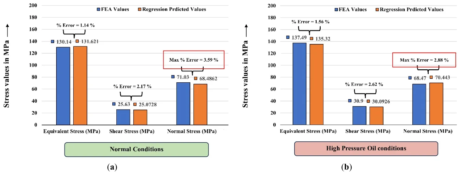 . Percentage error analysis for stress parameters of (<b>a</b>) Normal Conditions, (<b>b</b>) High Pressure Oil conditions.