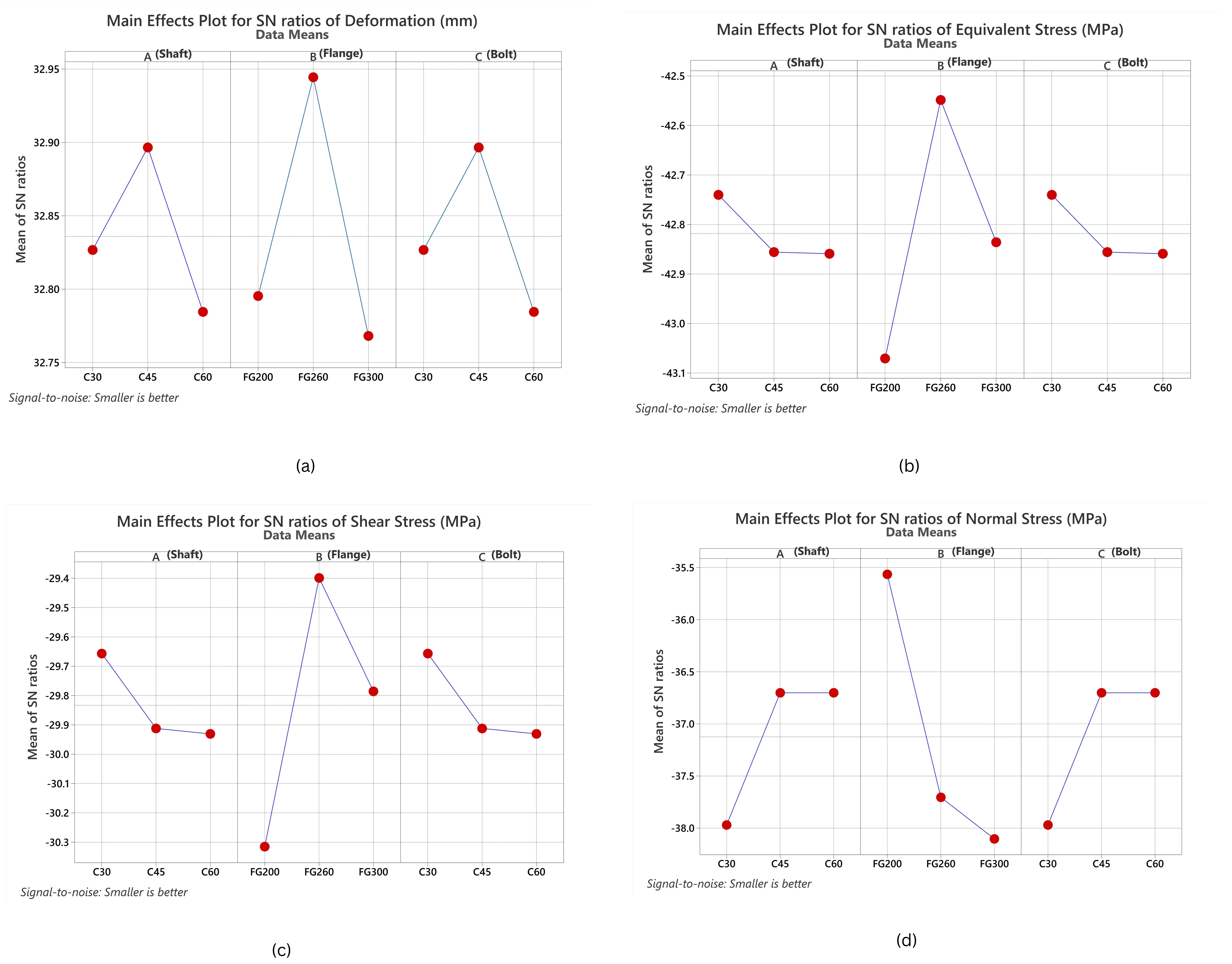 ) was conducted using the baseline optimal configuration A1–B1–C2, representing C30 shaft, FG200 flange, and C45 bolt. The analysis revealed that this combination produced the highest composite desirability score of 0.6667, effectively minimizing all four output responses. Alterations to this configuration—especially changes to the flange material—caused significant performance degradation. Specifically, replacing the flange with FG300 (B3) led to a desirability drop to 0.0000, indicating a sharp decline in mechanical performance. Adjustments to the shaft (A2, A3) or bolt (C1, C3) resulted in moderate reductions but did not completely compromise performance. These findings confirm that flange material selection is the most critical factor under atmospheric conditions, and that the optimal configuration A1–B1–C2 offers a robust balance of strength, stiffness, and stress control across all metrics.