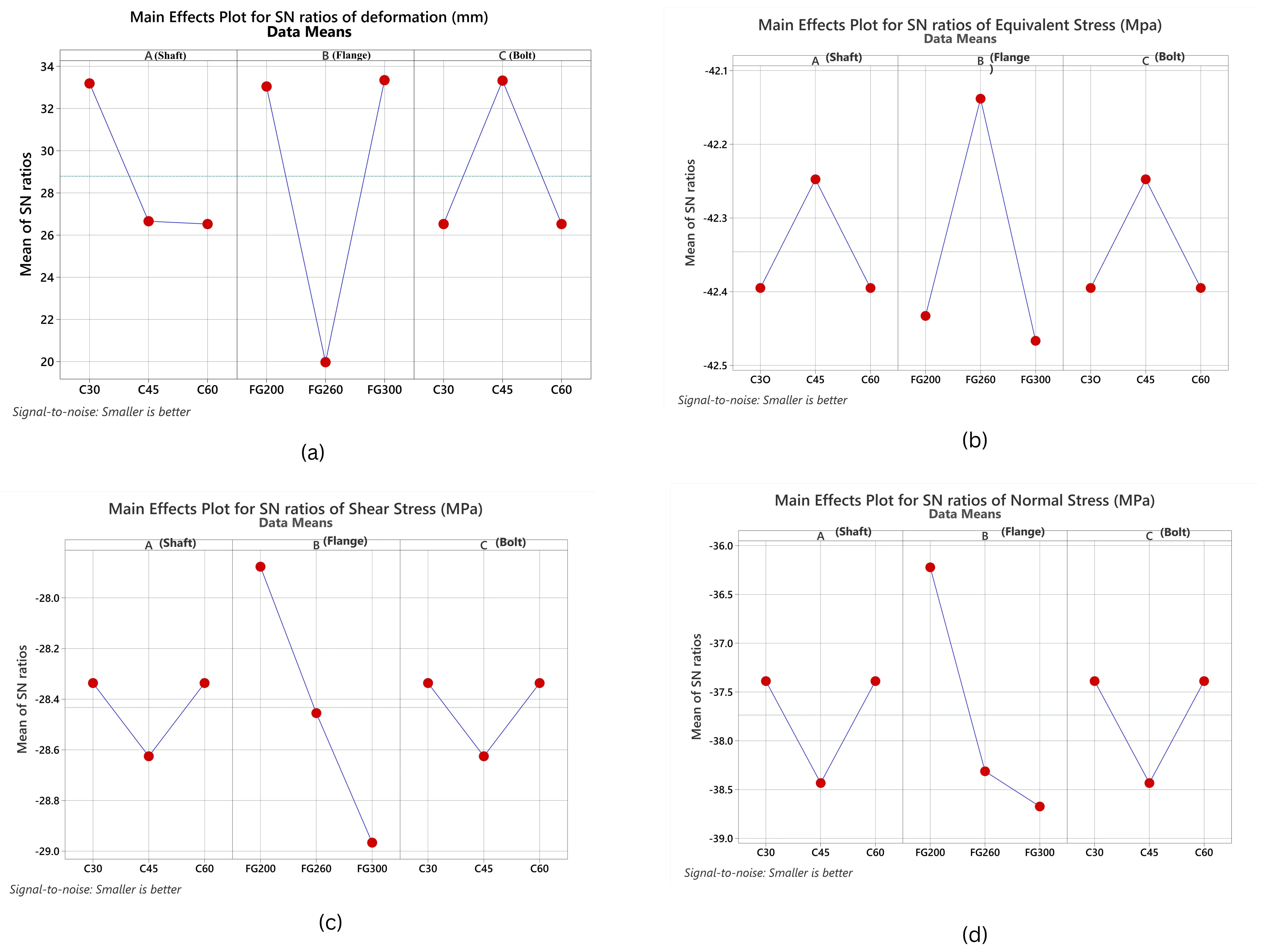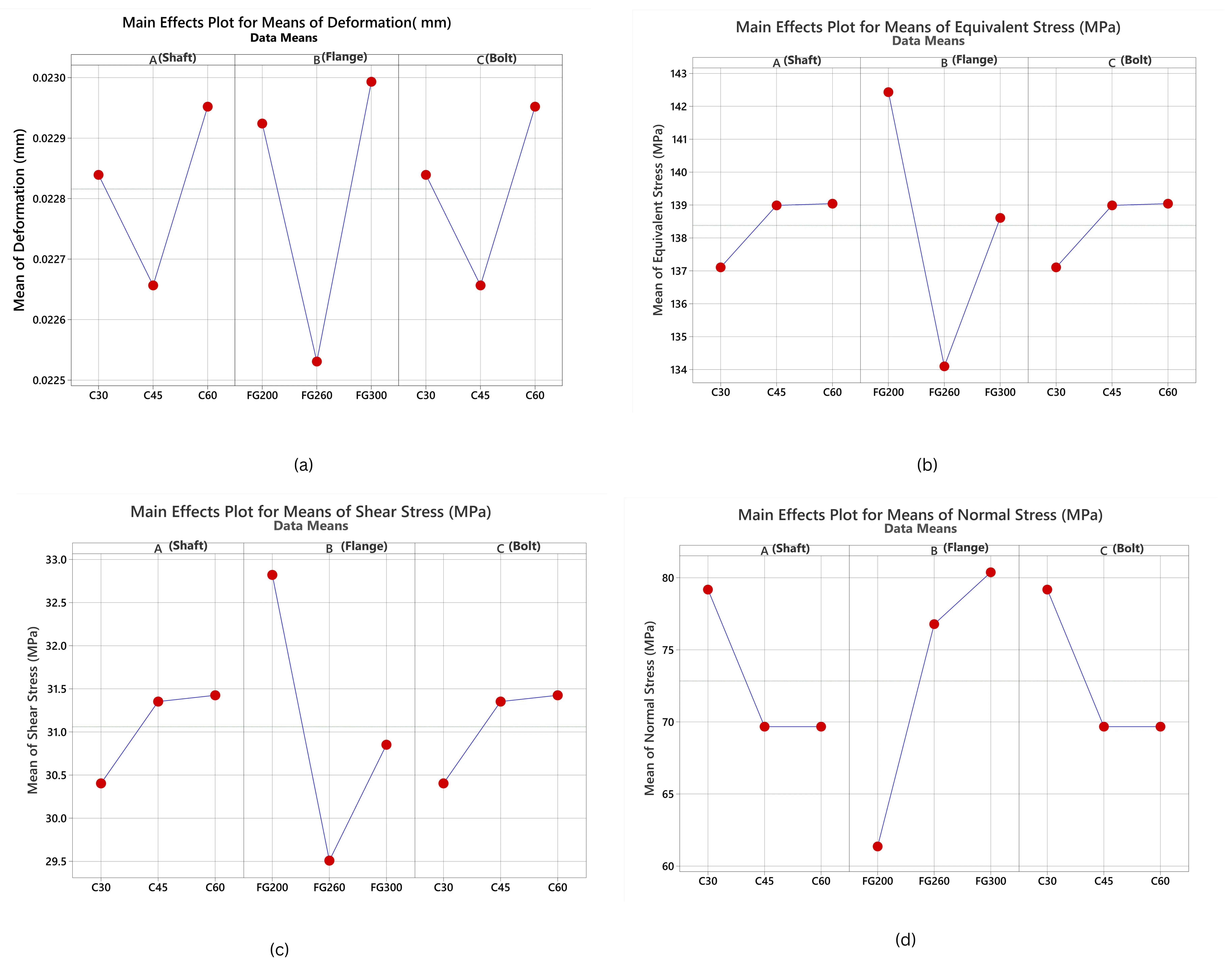It is important to note that the optimal settings obtained from the main effects plots (e.g., C30 shaft–FG200 flange–C45 bolt) differ slightly from those identified through desirability analysis (A1B1C2 combination). This variation arises because the main effects plots optimize each response independently (total deformation, equivalent stress, shear stress, normal stress), whereas desirability analysis integrates all responses into a single composite desirability index. In the case of the atmospheric condition, FG200 appears more favorable than FG300 since its lower stiffness allows better stress redistribution and reduced local stress concentrations, despite slightly higher deformation. Conversely, FG260 and FG300 demonstrate superior performance under high-pressure oil conditions due to their higher compressive strength and damping capacity, which help resist external hydrostatic pressure and minimize deformation. This trade-off highlights that while FG200 is efficient in air (lighter loading environment), higher-grade cast irons (FG260/FG300) are essential when couplings operate in submerged or pressurized environments.