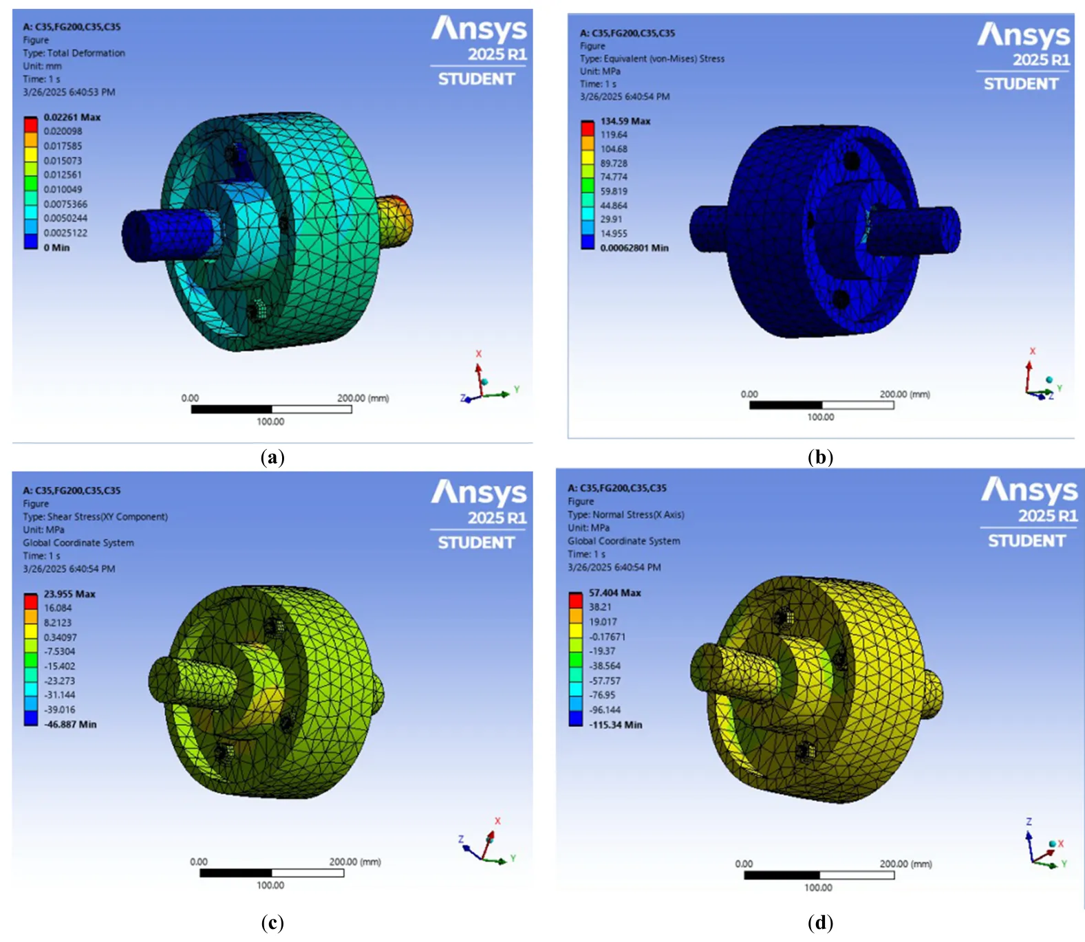 shows the desirability-based optimization revealed distinct material configurations for each environment. For normal atmospheric air, the optimal setup—C30 shaft, FG200 flange, and C45 bolt—achieved a composite desirability of 0.6667, minimizing stress and deformation. Under high-pressure oil conditions, the best configuration shifted to C45 shaft, FG260 flange, and C45 bolt, with a higher desirability of 0.7185 and notably reduced deformation. These results highlight the influence of environmental pressure on material performance and reinforce the critical role of flange material in overall coupling modeling.