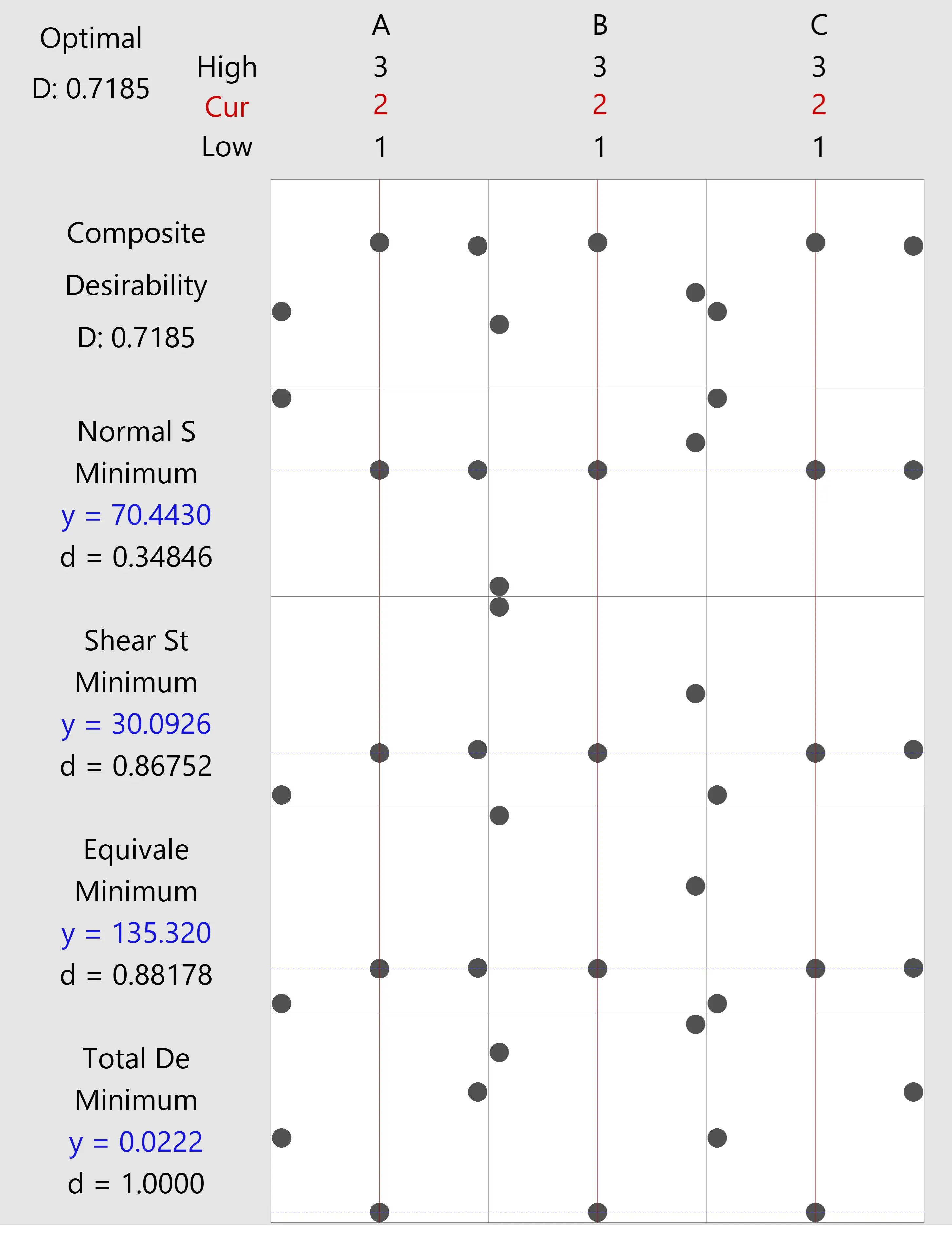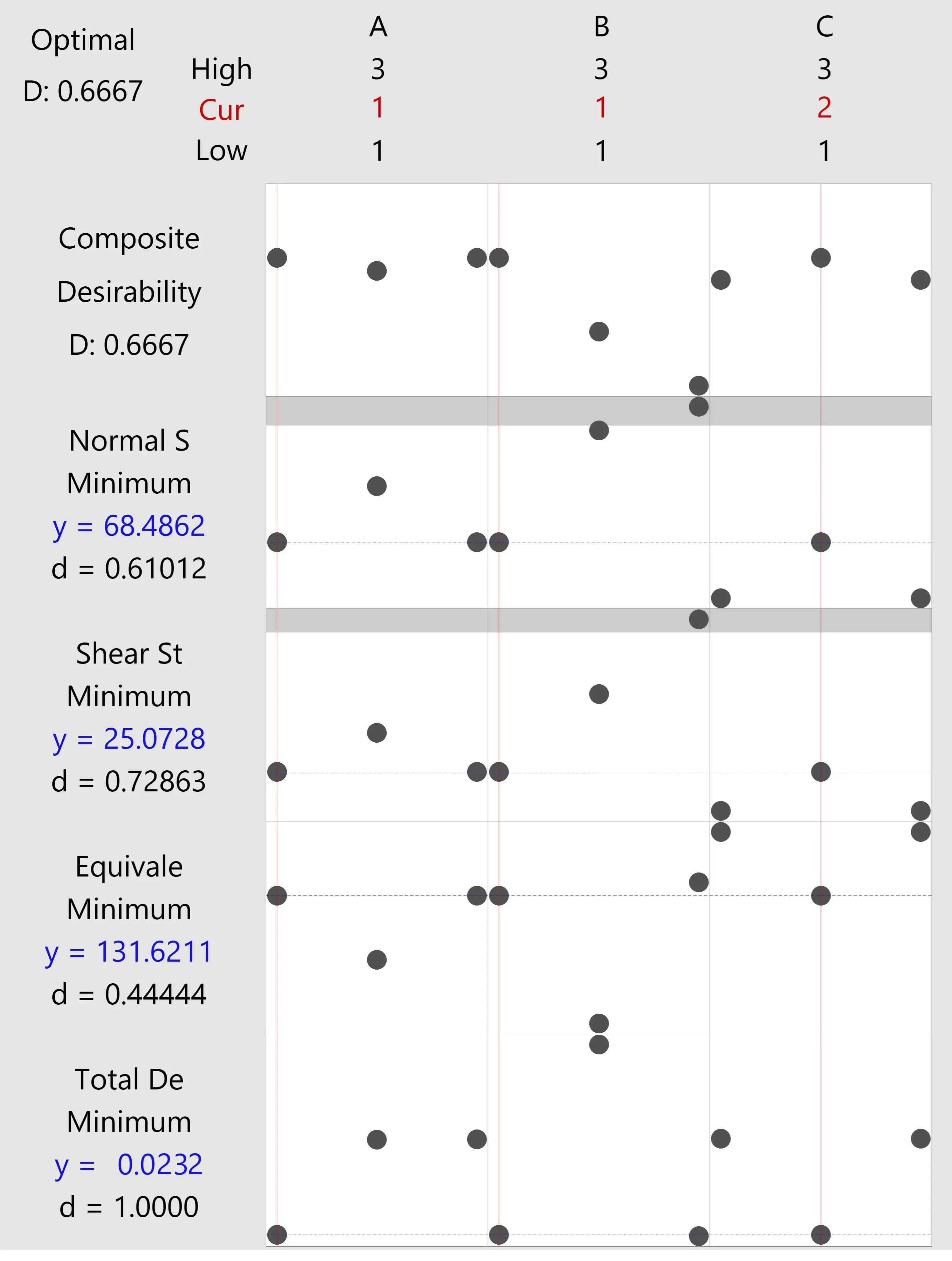 . Utilizing DA to optimize multiple responses of high pressure oil conditions ( Red text indicates factor levels used in the Taguchi design: High (3), Cur/Current (2), and Low (1). Blue text shows the predicted response values (y) and corresponding desirability index (d) for each response).