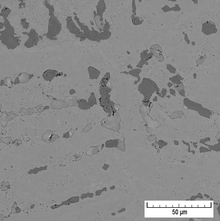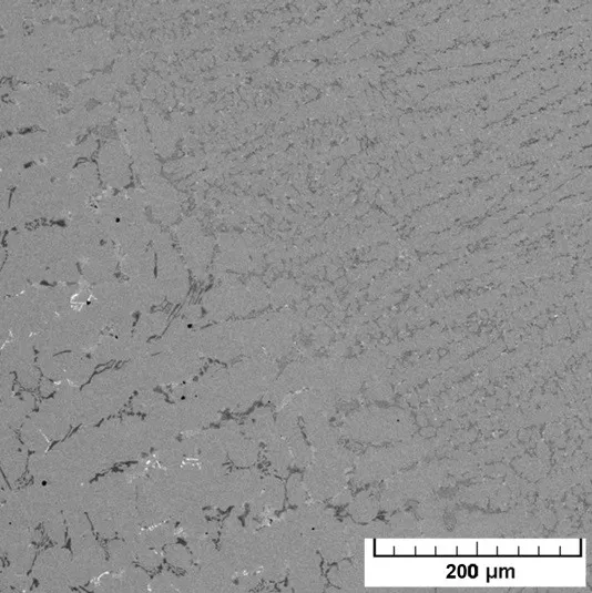 shows the microstructure of the 32%Cr-43%Ni alloy in its state of supply. In the backscattered electron image, chromium carbides have a darker contrast compared to the austenitic matrix, whereas niobium carbides have a lighter contrast due to differences in average atomic number. These data are confirmed by studies of the local composition of the observed phases. A quantitative phase analysis based on phase separation by contrast level was performed on a representative series of image fields. shows the average values of the volume fraction of dispersed phases of the base metal, the welded metal, and the HAZ in the state of supply and after long-term strength tests.